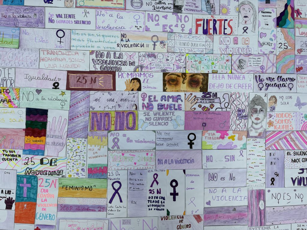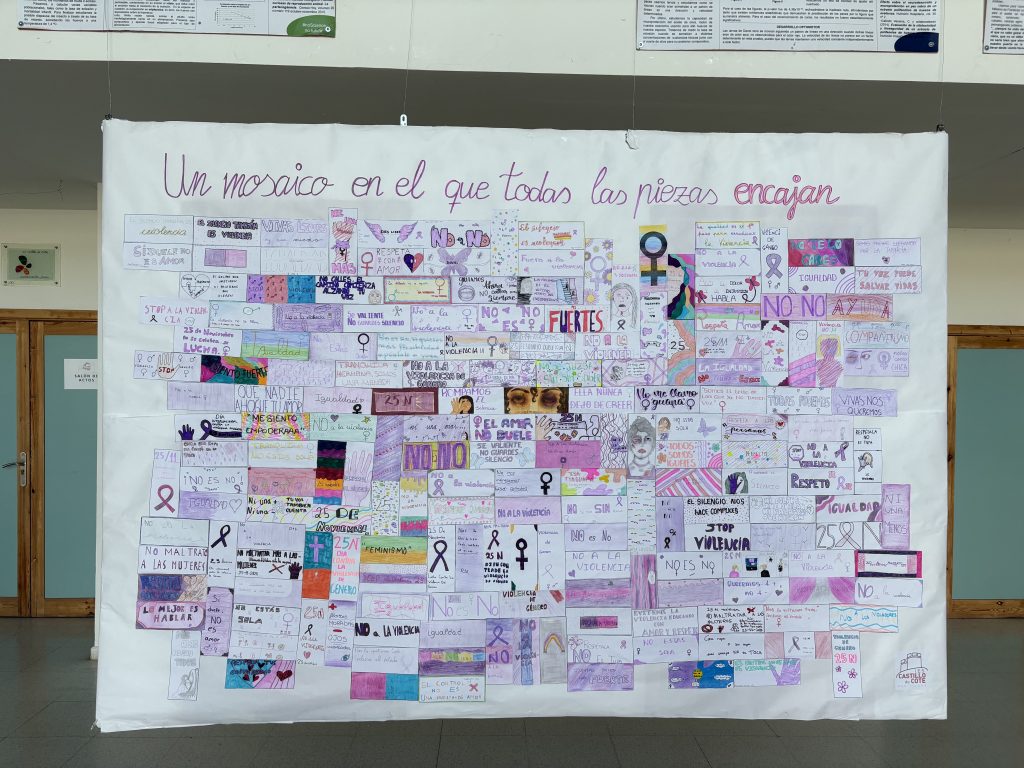 Este mosaico está formado por piezas individuales decoradas por los estudiantes, cada una con frases, dibujos y colores que representan sus reflexiones sobre la violencia de género y la lucha por la igualdad. Cada pieza, aunque única, se integra perfectamente en el conjunto, simbolizando cómo, a través de la unión y el respeto mutuo, podemos construir una sociedad más justa y libre de violencia.